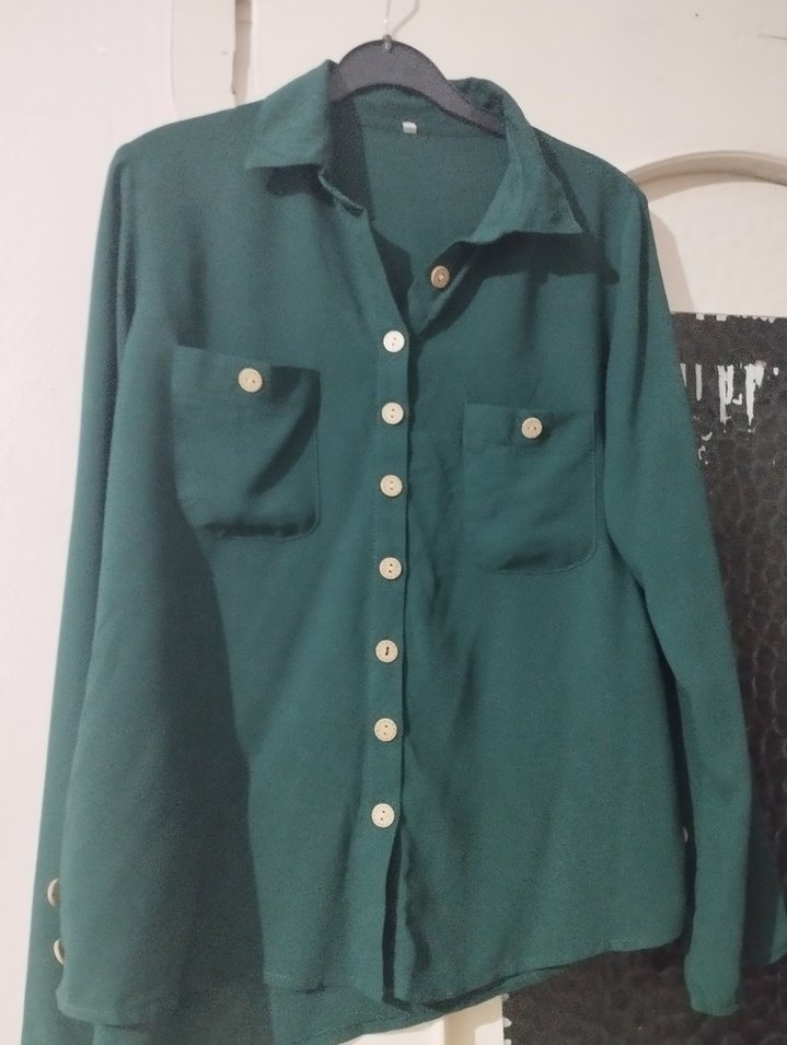 Düğmeli, uzun kollu, yeşil kadın gömleği. Notlu yaka, iki cep ve bol kesim ile günlük sokak stili için uygundur. Sentetik dokusu yumuşaktır.