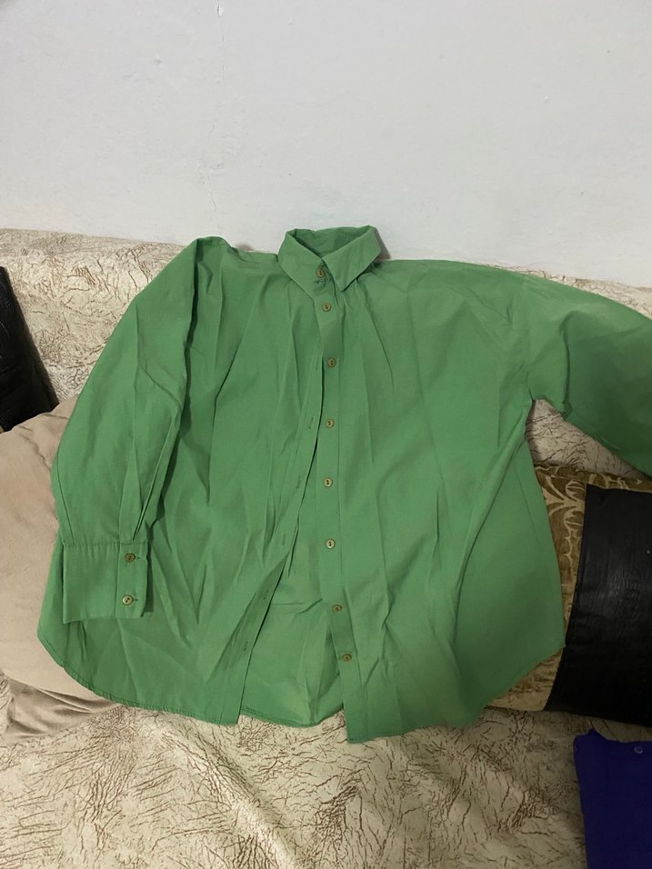 Düğmeli, uzun kollu, yeşil gömlek, rahat kesimli ve yakalı, günlük kullanıma uygun.