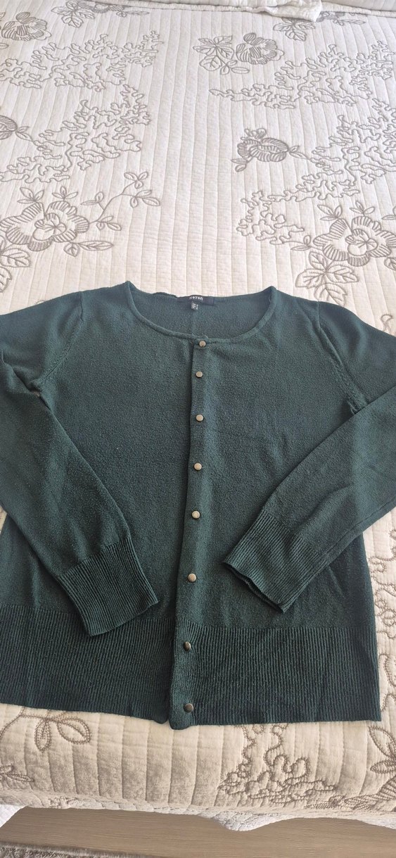 Düğmeli, yuvarlak yakalı ve uzun kollu yeşil kadın hırka. Yumuşak yün kumaştan, bol kesim ve normal midi boyda, günlük kullanıma uygun.