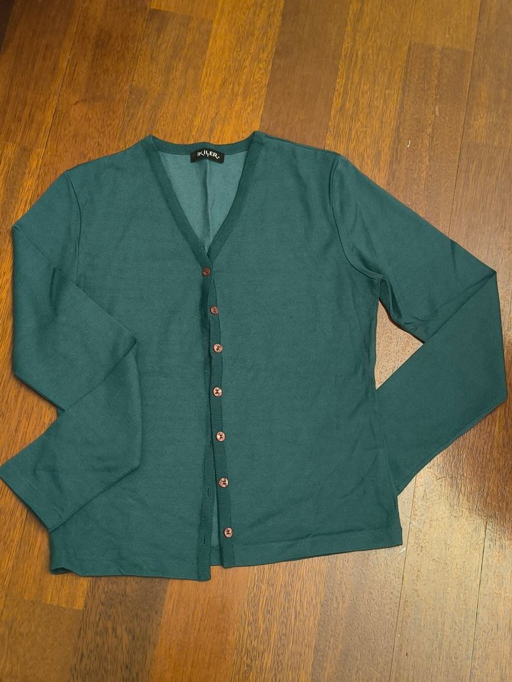 Düğmeli ön kısmı, uzun kollu ve yuvarlak yaka detayı bulunan koyu yeşil kadın hırka. Rahat ve normal midi boyda, yumuşak ve sıcak kumaştan üretilmiştir. İki koltukaltı arası 43 cm.Omuzdan etekucuna 55 cm.