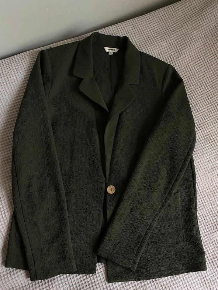 Düğmeli, keten kumaştan yapılmış, yeşil renkte, normal uzunlukta düğmeli kadın blazer ceket. Ofis için uygundur ve klasik kesime sahiptir.