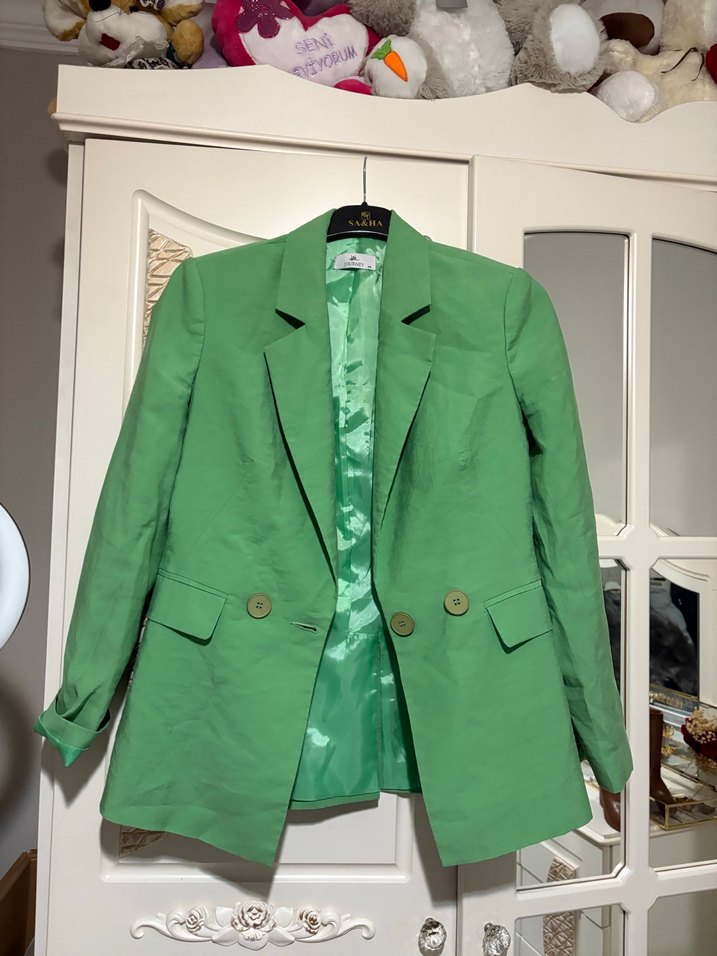 Düğmeli, yeşil keten blazer ceket, normal uzunlukta ve regular fit. Notch yaka ve parlak dokusu ile ofis ve günlük şıklık için ideal.