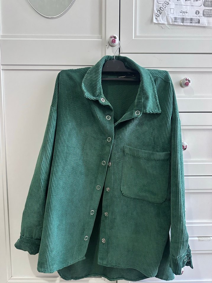 Uzun kollu, düğmeli, yeşil keten gömlek. Salaş kesim ve çıtmalı yakasıyla günlük sokak stili için uygun.✨