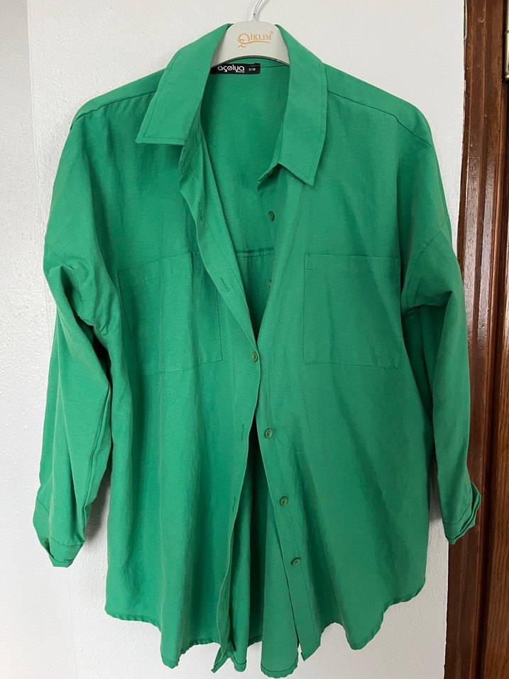 Yeşil, düğmeli, keten kumaştan, bol kesim ve yakalı, uzun kollu kadın gömleği. Günlük rahat sokak stili için uygundur.