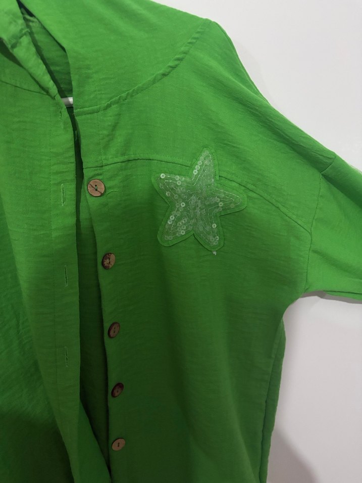 Uzun kollu, keten kumaştan yapılmış yeşil gömlek, düğmeli ve yaka kısmı kesimli. Nakış ve parlak yıldız detayıyla bohem tarzda, rahat kesim.