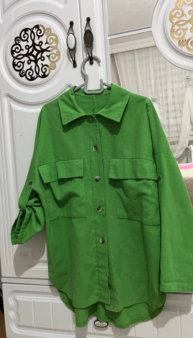 Düğmeli, uzun kollu, keten kumaştan yapılmış yeşil gömlek. Notlu yakalı, bol kesim ve parlak dokulu, günlük sokak stili için uygun.