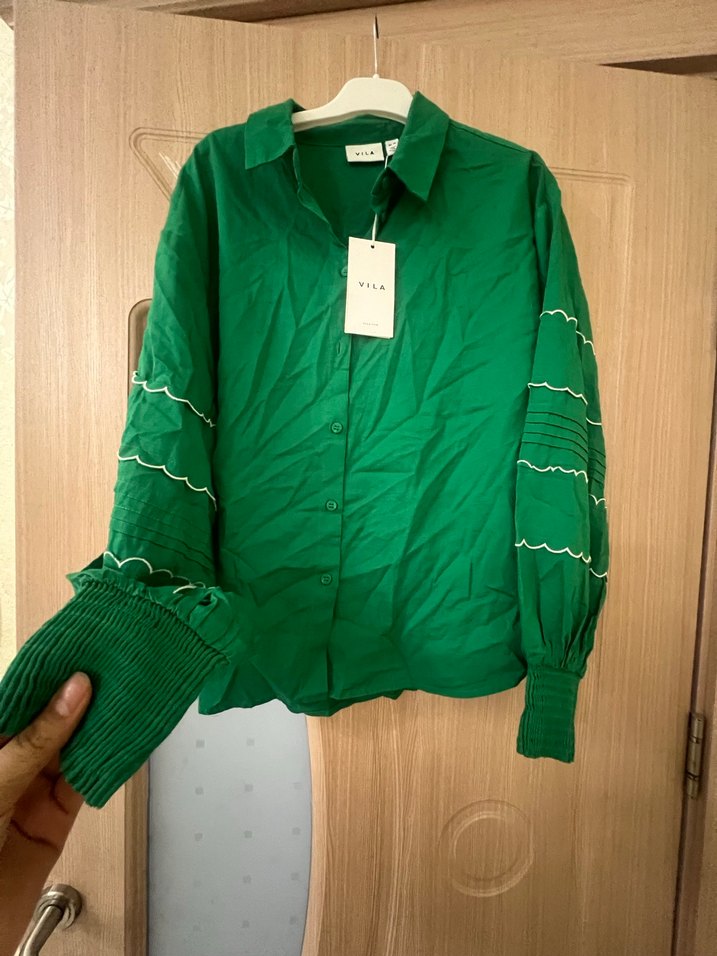 Düğmeli önü ve yeşil rengiyle, keten kumaştan yapılmış uzun kollu kadın gömleği. Notlu yaka ve parlak dokusu, günlük rahat stil için uygundur.