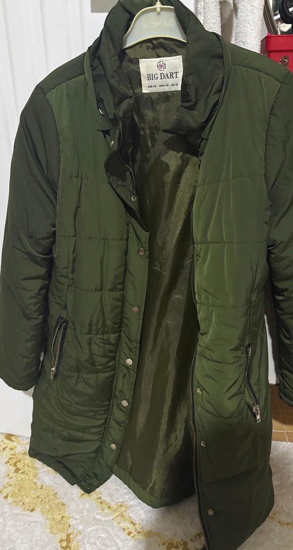 Düğmeli, uzun kollu, yeşil kadın kışlık mont. Normal midi boyda, ince kesim ve yaka detayı notched lapel. Fermuarlı cepleri ve BIGDART etiketi bulunur.