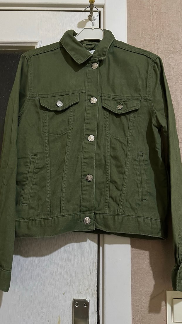 Düğmeli, yeşil renkli kadın kot ceket, notlu yaka ve uzun kolludur. Normal boyda, regular fit ve sentetik kumaştan yapılmıştır, günlük kullanıma uygundur. Yaka kısmı saç boyası olmuştur fakat o yüzden fiyatı düşük tuttum iç kısmında kalıyor ve belli olmuyor Boy:57cm