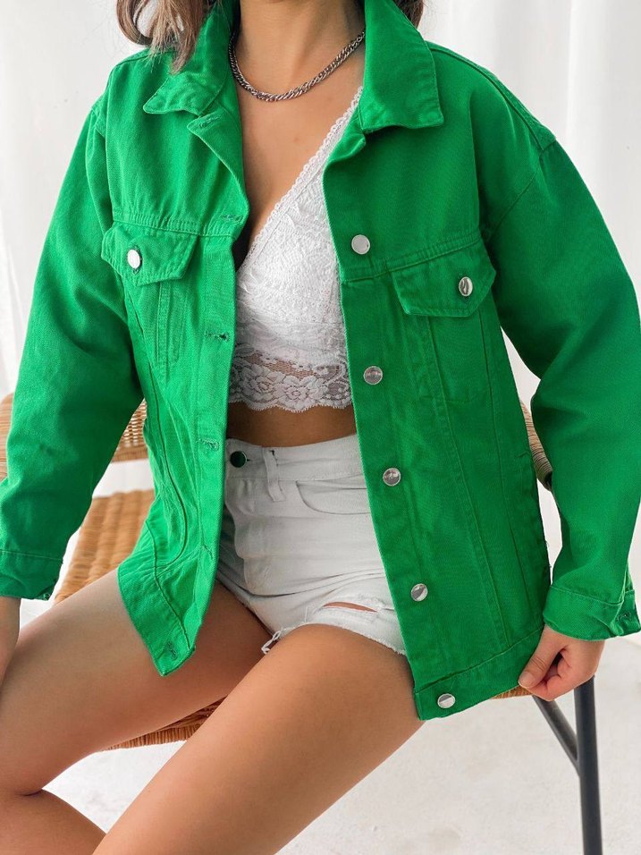 Düğmeli, bol kesim ve yeşil renkte kısa kot ceket. Pamuklu kumaştan, günlük ve sokak tarzına uygun, yakası kesik ve askılı kollu.