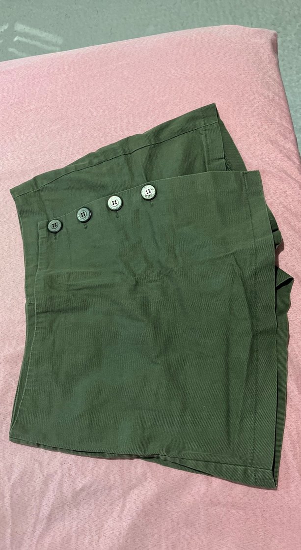 Düğmeli, bol kesim, koyu yeşil kadın kumaş midi şort etek , günlük rahat kullanım için sentetik kumaştan yapılmıştır.