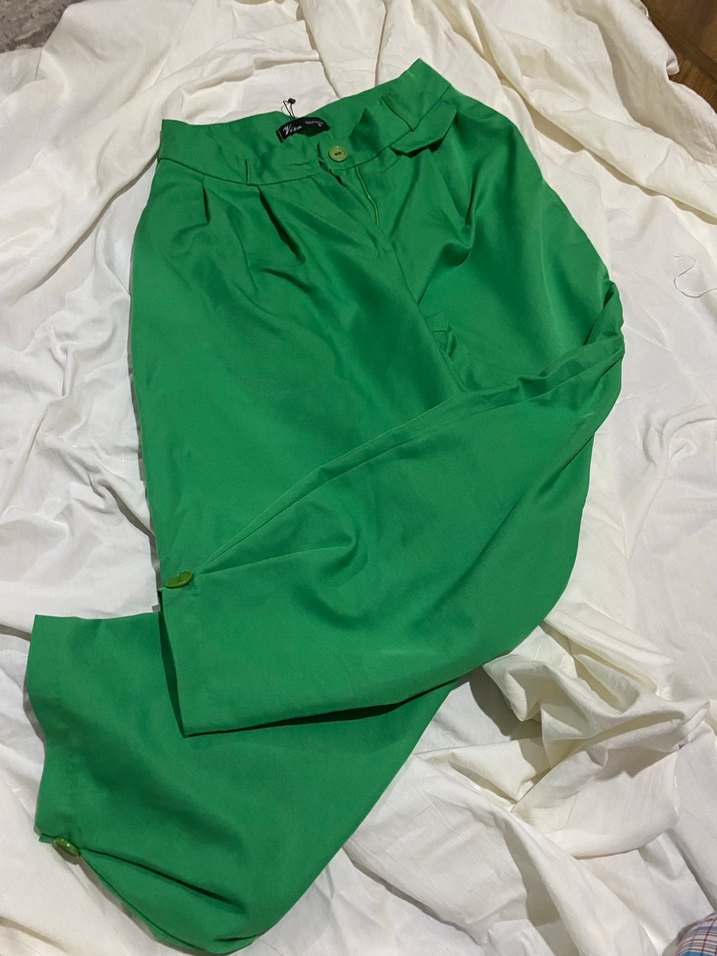 Düğmeli detaylı, yeşil renkli, bol kesim ve satenimsi dokulu kadın kumaş pantolon. Midi boyda, günlük sokak modasına uygun.