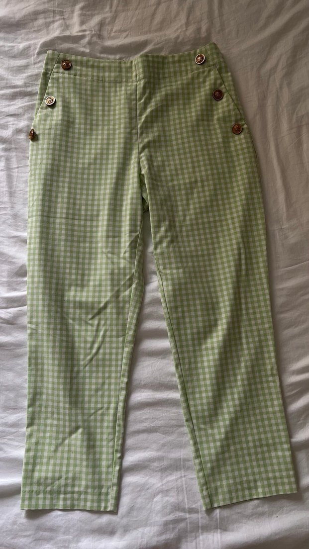 Pamuklu, düğmeli, normal boy midi yeşil kumaş pantolon. Rahat kesimi. Zara marka. Sadece 2-3 sefer giyindi.