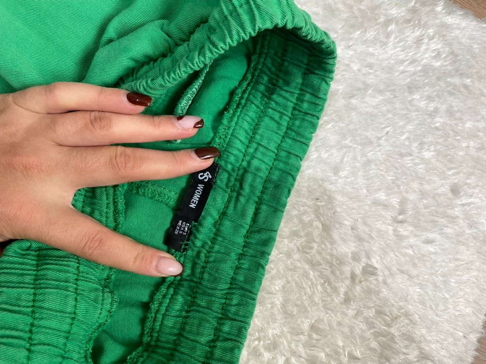 Düğmeli, parlak yeşil kumaş pantolon, normal boy midi kesim ve rahat sokak stili için uygundur.