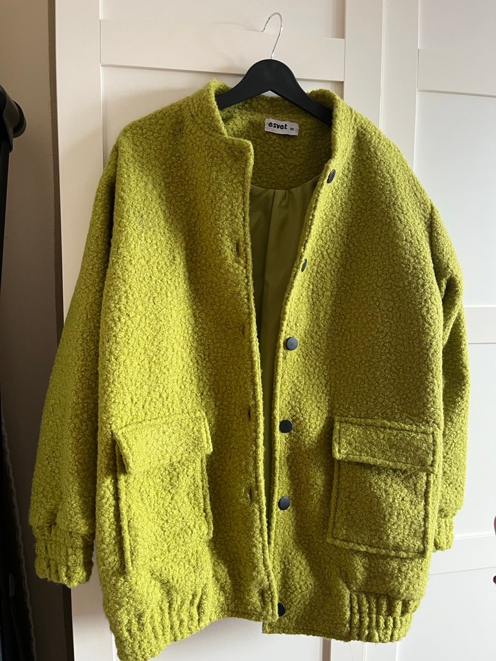 Düğmeli, uzun kollu, yeşil midi ceket. Rahat kesim ve yumuşak dokusuyla günlük rahat sokak stili için uygundur.