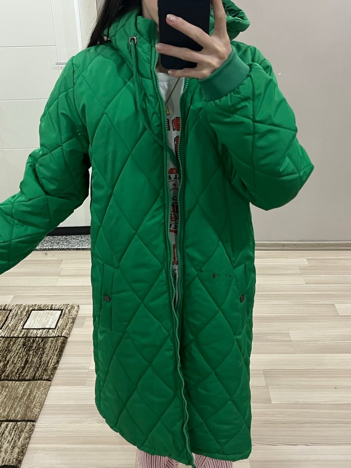 Düğmeli, uzun kollu ve koyu yeşil renkte, rahat ve sıcak kumaştan yapılmış kadın midi kaban. Notlu yaka ve desensiz tasarımı ile günlük kullanıma uygun.