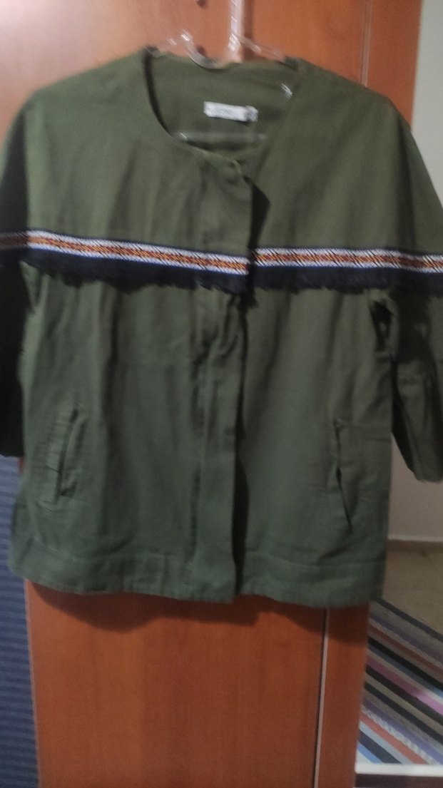 Düğmeli, nakış detaylı yeşil kadın mini ceket, bol kesim ve uzun kolludur. Günlük rahat sokak stili için uygundur.