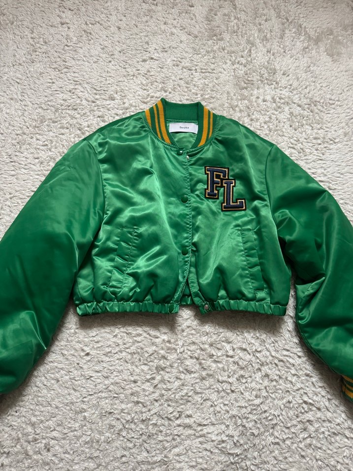 Düğmeli, parlak yeşil renkli kadın street wear ceketi, uzun kollu, nakış detaylı ve bol kesimdir. Günlük kullanıma uygundur.