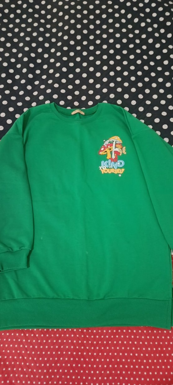 Düğmeli, renkli baskılı yeşil sweatshirt, yuvarlak yaka ve uzun kollu, bol kesim. Yumuşak ve sıcak kumaştan günlük kullanım için uygundur.