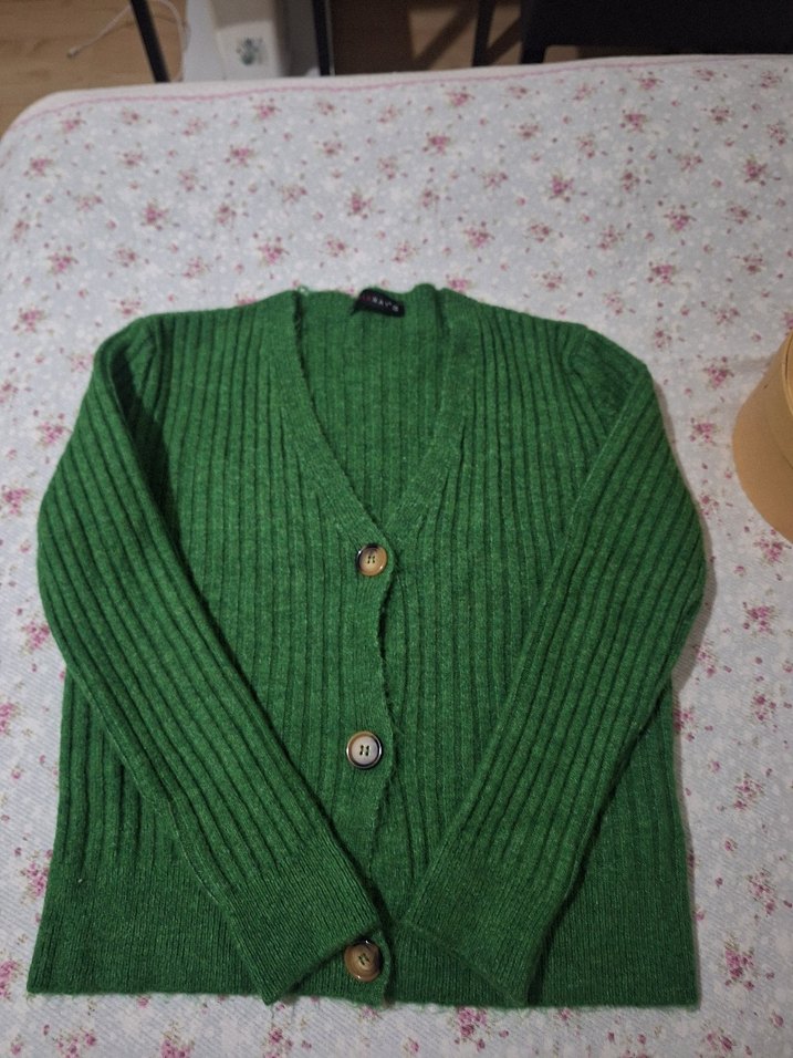 Düğmeli, uzun kollu yeşil triko hırka, rahat ve salaş kesimiyle günlük kullanıma uygundur.