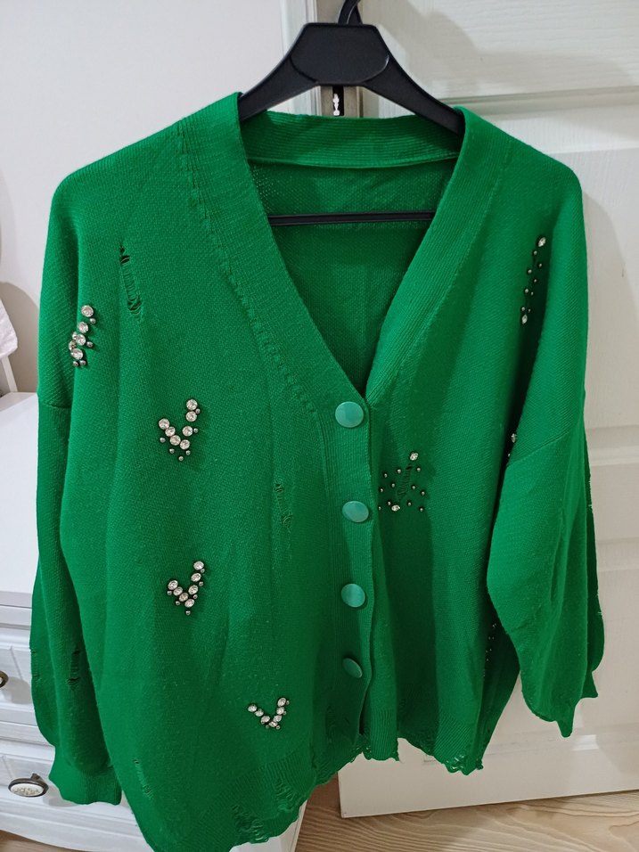 Düğmeli, parlak işlemeli yeşil triko hırka, uzun kollu ve notalı yaka ile salaş kesim sunar. Midi boyda. iki kere giyildi tertemiz sorunu yok