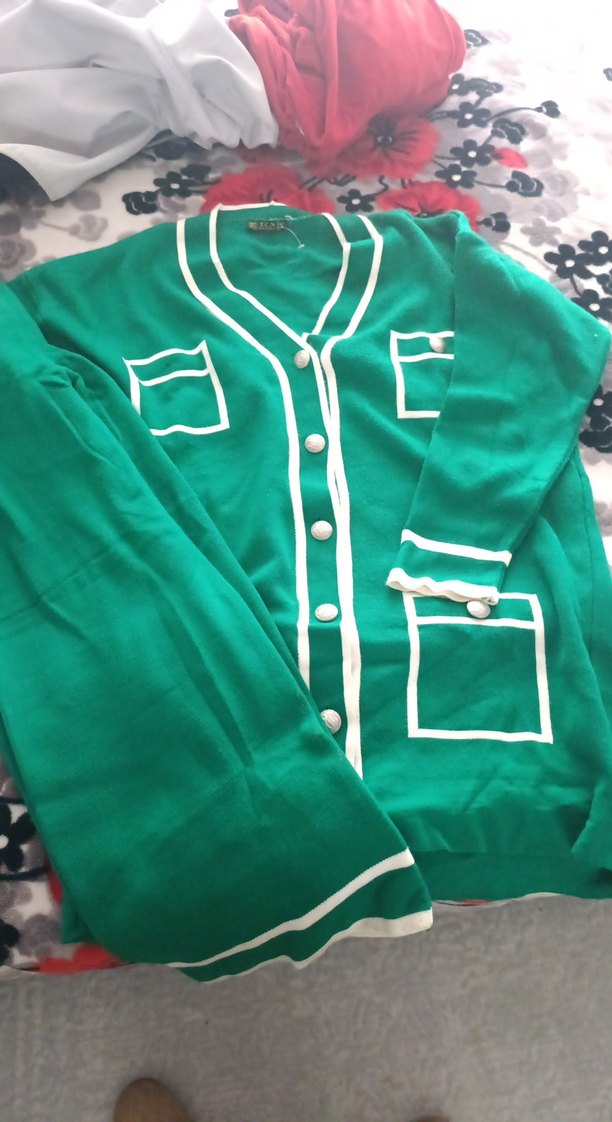 Düğmeli, uzun kollu ve bol kesim yeşil örgü kadın hırka. Beyaz şerit detaylı, notched lapel yakalı, rahat ve şık bir sokak stili parçası.