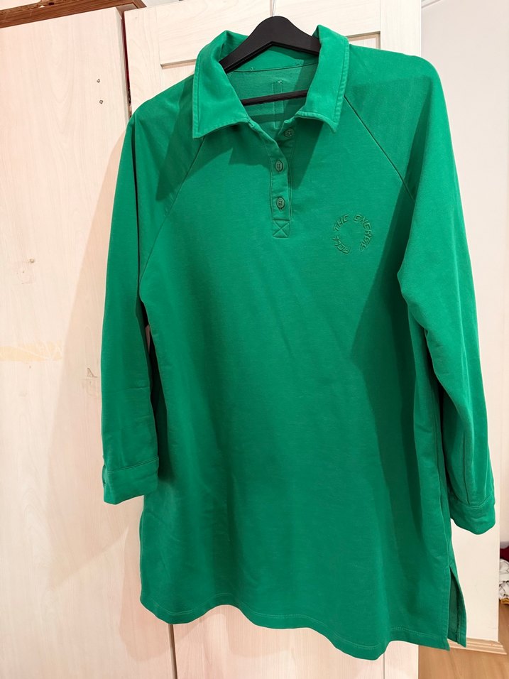Düğmeli ve yakalı, yumuşak ve sıcak kumaştan yapılmış yeşil, uzun kollu bol kesim tişört. Günlük sokak stiline uygun, parlak görünümlü.