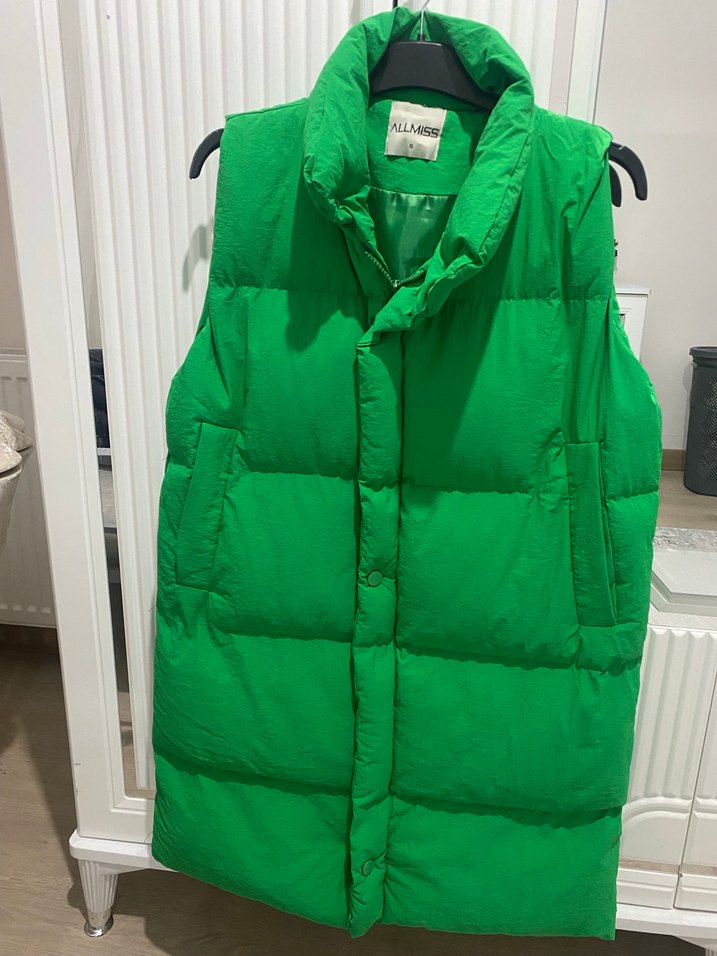 Düğmeli, yüksek yakalı yeşil kapitone yelek, parlak görünümlü ve rahat kesimlidir. Sokak stiline uygun, yumuşak ve sıcak kumaştan üretilmiştir.