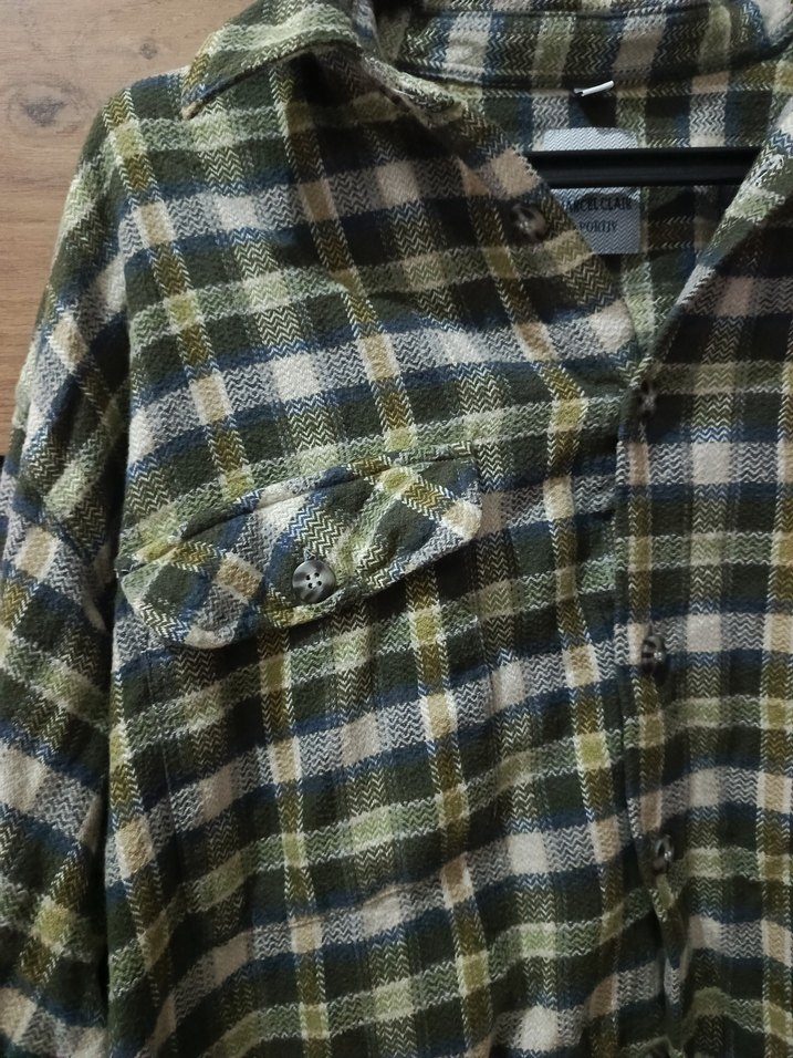 Düğmeli, uzun kollu, yeşil ve gri kareli desenli, notlu yaka ve bol kesim kadın gömlek. Tekstil kumaştan üretilmiştir, rahat kullanım sağlar.