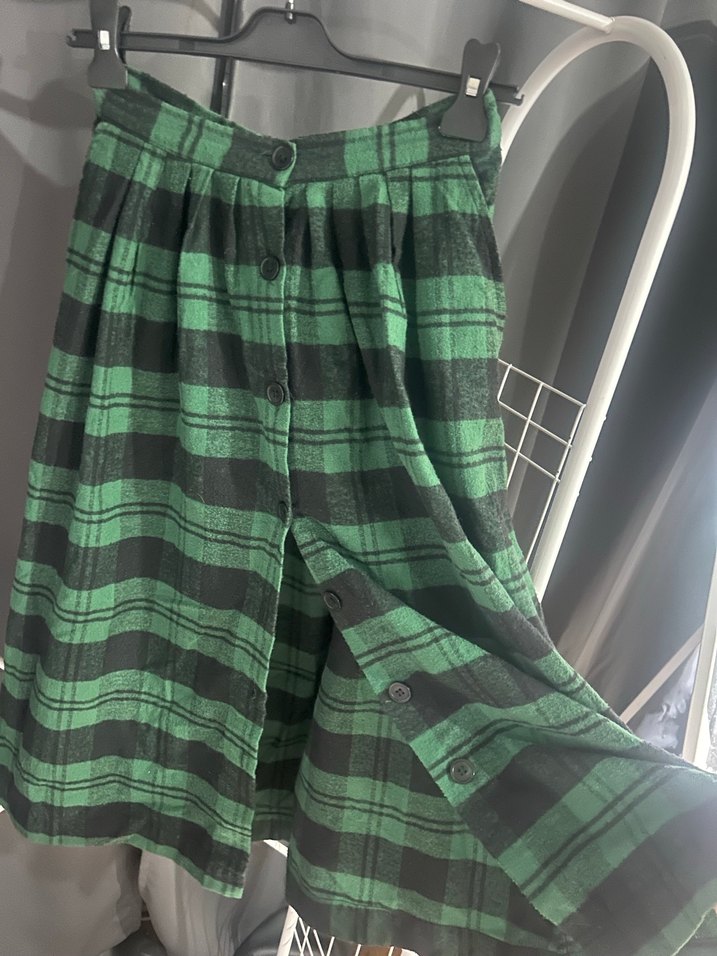 Düğmeli, koyu yeşil kareli desene sahip, rahat kesim hamile midi eteği. Yumuşak sentetik kumaştan üretilmiştir, günlük kullanıma uygundur.