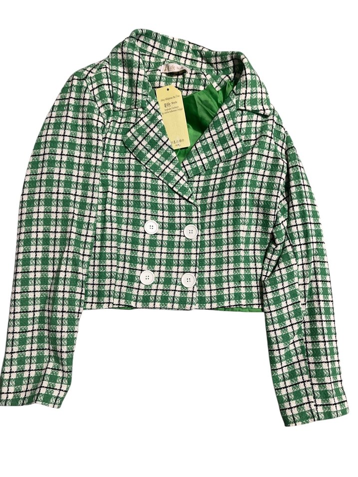Düğmeli, yeşil kareli kadın blazer ceket, notalı yaka ve uzun kolludur. Regular fit ve parlak yüzeyli, günlük sokak stili için uygundur.