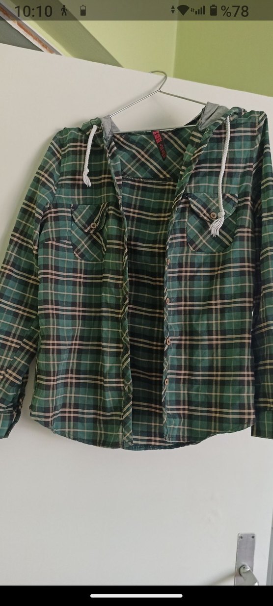 Uzun kollu, düğmeli ve cepli bu yeşil kareli kadın gömlek, rahat kesimi ve notlu yaka detayıyla günlük kullanım için uygundur.
