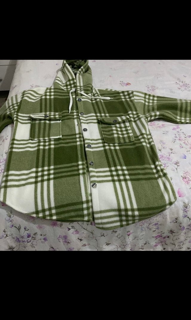 Düğmeli ön kısmı ve yaka detayı olan, açık yeşil kareli kadın gömlek. Uzun kollu, bol kesim ve yumuşak, sıcak kumaştan midi boyda, rahat sokak stili için ideal.