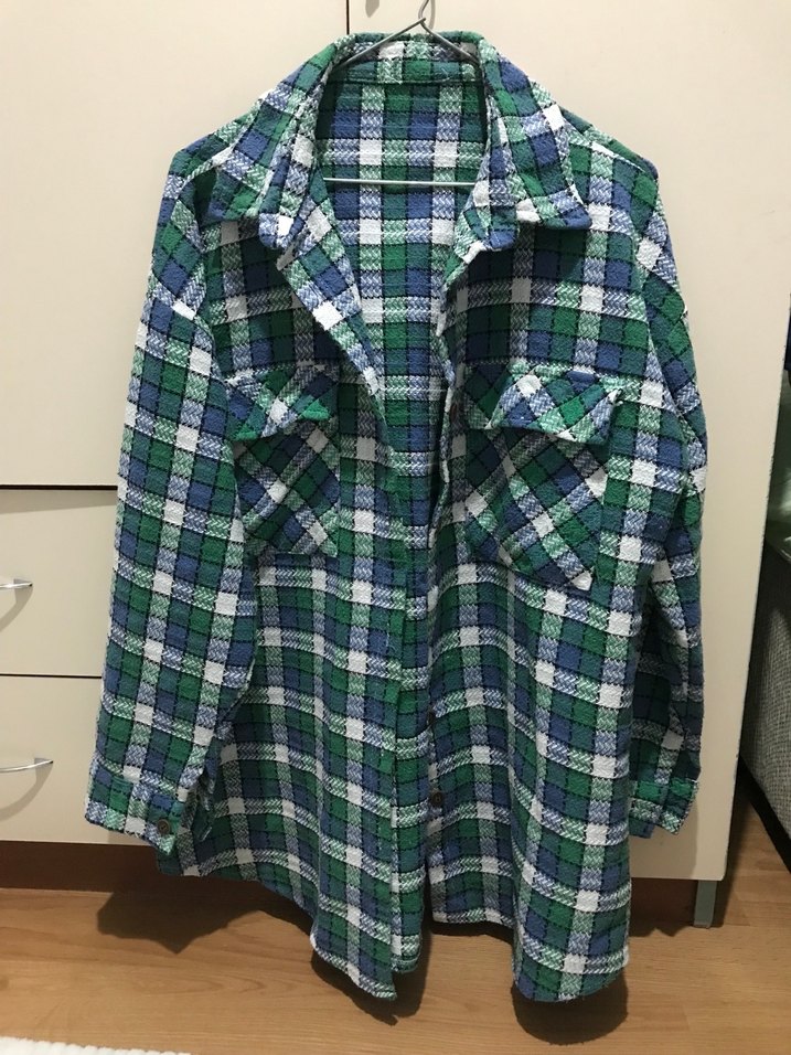 Düğmeli, uzun kollu, yeşil kareli kadın gömleği. Notch yaka ve rahat kesim ile günlük sokak stiline uygundur. L ve xl uygun