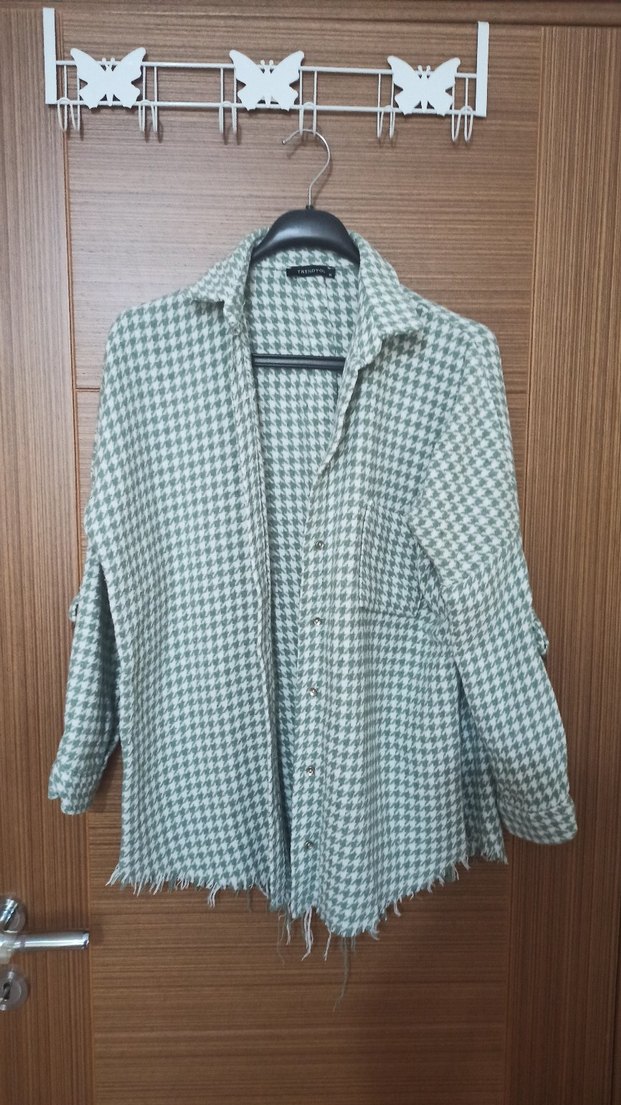 yeşil kareli, uzun kollu, düğmeli, normal midi boyda, notched lapel yakalı kadın gömleği. Rahat kesim ve günlük kullanım için uygundur. kolları ayarlanabilir.
