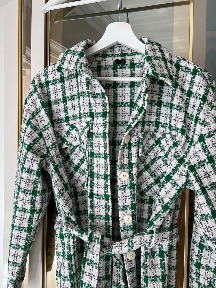Düğmeli önü ve yakası kesik detaylı, yeşil ve gri kareli desende sentetik kumaştan uzun kollu gömlek. Bel kemeri ve regular fit ile bohem ve retro tarzı yansıtıyor.