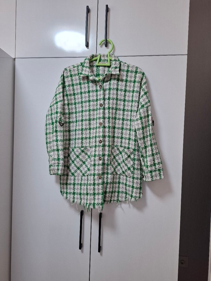 Notched lapel yaka, düğmeli önü ve uzun kollu kadın gömlek. Normal kesim ve midi boyda, açık yeşil kareli deseniyle rahat sokak stili sunar. S beden