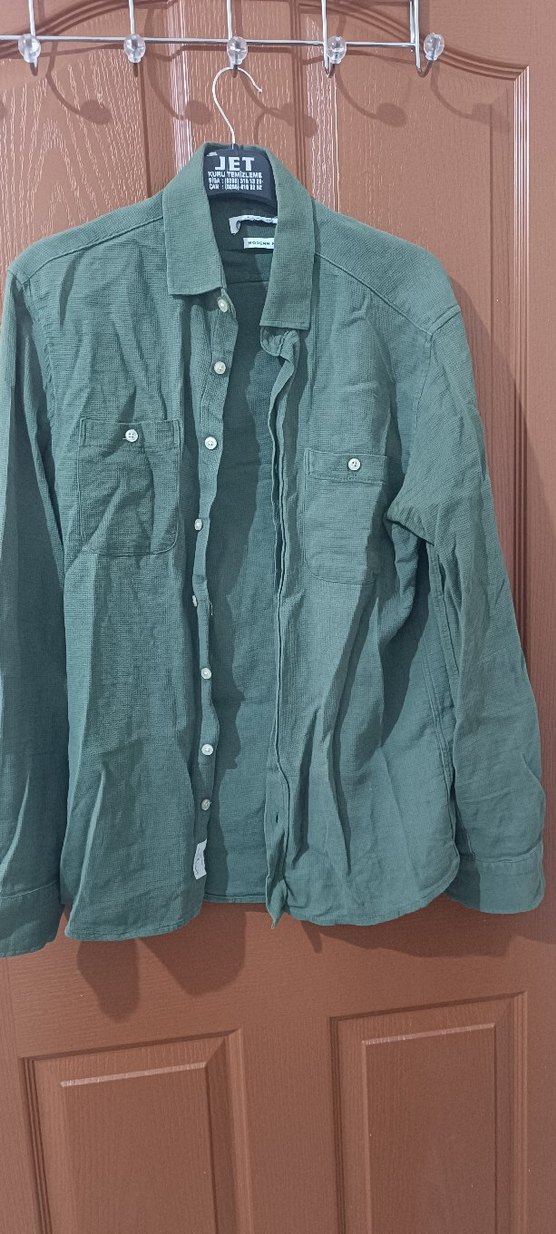 Uzun kollu, düğmeli cepli ve keten kumaştan yapılmış yeşil erkek gömleği. Rahat kesimi ve notched lapel yakasıyla gündelik sokak stiline uygundur.