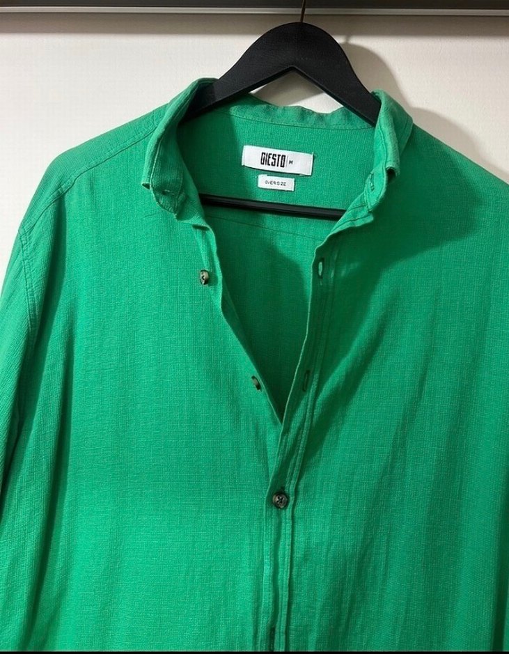 Yeşil keten erkek gömlek, uzun kollu ve düğmeli. Salaş kesim, yakalı, parlak kumaşlı, desensiz, midi boyda günlük rahat stil için uygun.