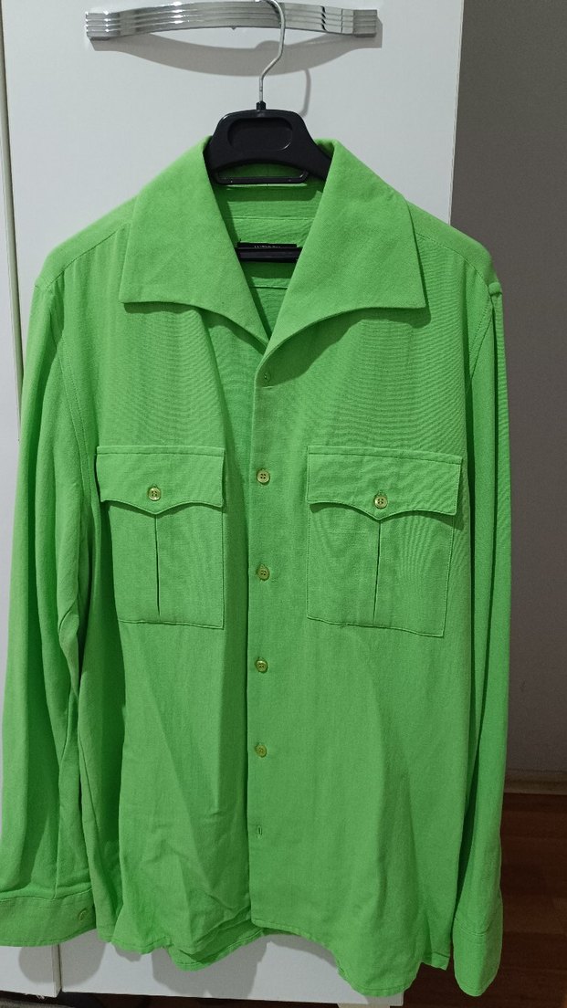 Düğmeli, uzun kollu yeşil keten gömlek. Normal kesim, kesik yaka ve iki cep detayına sahip, ofis için uygun.