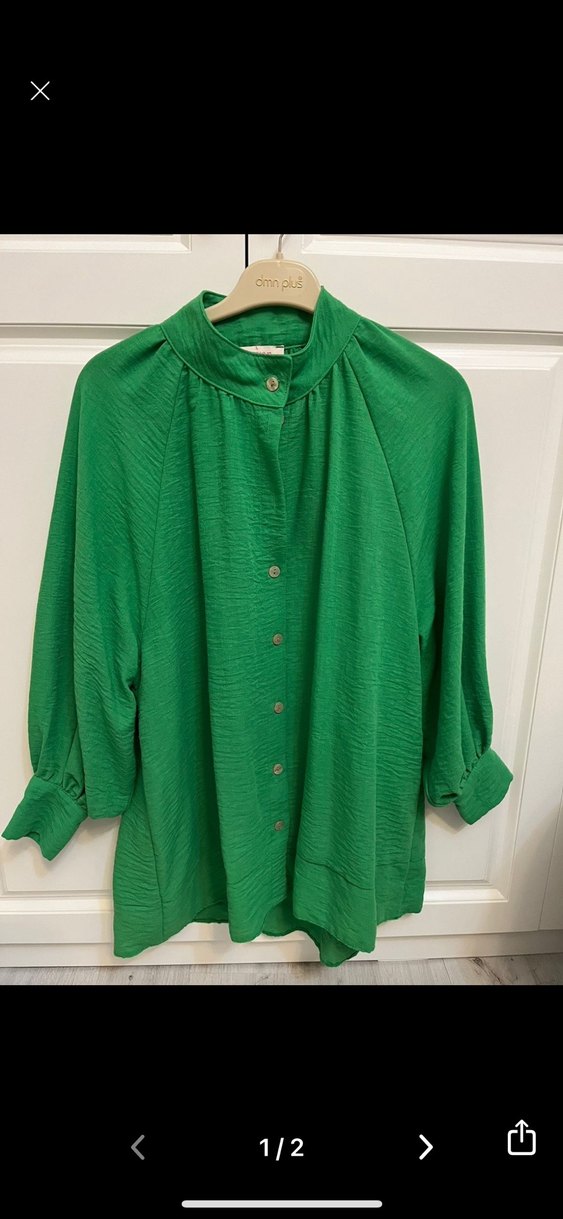 Parlak yeşil keten gömlek, yüksek yakalı, uzun kollu ve bol kesimdir. Düğmeli önü ve midi boyuyla bohem tarzı yansıtır.