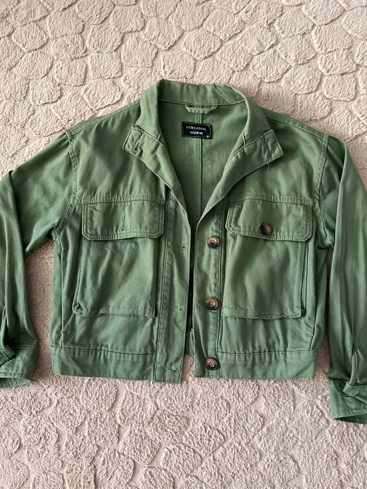 Düğmeli önü, kesik yaka ve uzun kollu yeşil keten ceket. Salaş kesim ve normal boyda, günlük sokak stiline uygun. Desensiz ve rahat kullanımlık.