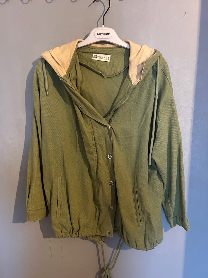 Düğmeli, keten kumaştan, uzun kollu, yeşil renkli bol kesim kadın ceket. Notlu yakası ve rahat sokak stili görünümü ile günlük kullanıma uygundur.