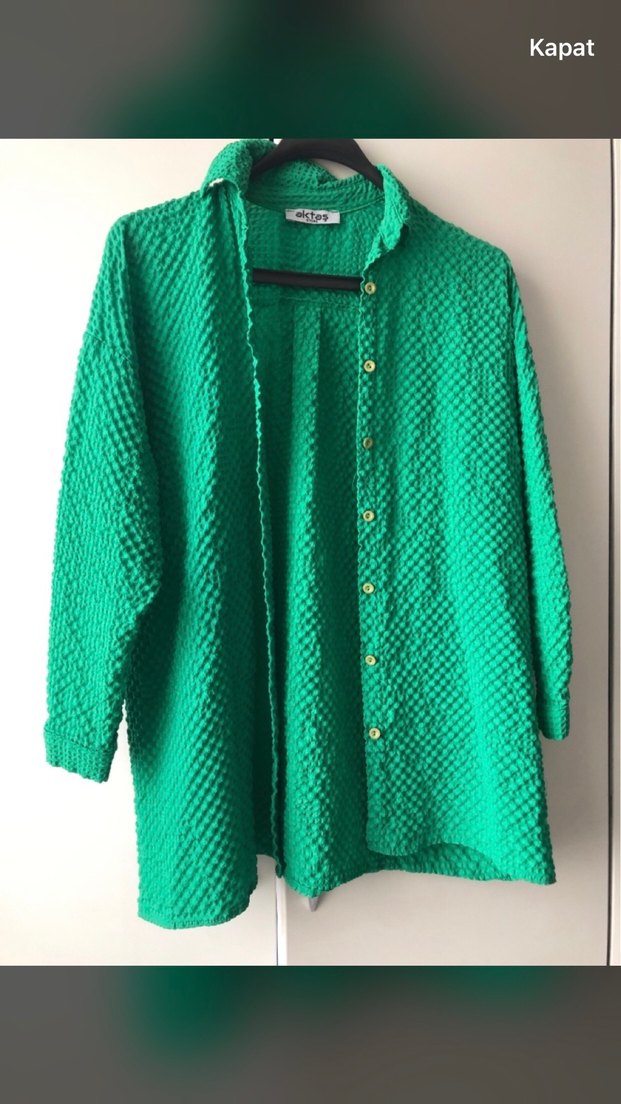 Düğmeli, keten kumaştan, uzun kollu, yeşil ve parlak dokulu salaş kesim gömlek. Notlu yakalı ve midi boyda, sokak stiline uygun.