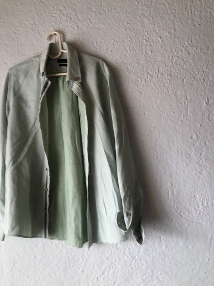 Düğmeli, keten kumaştan, yeşil renkte, uzun kollu, notched lapel yakalı, normal midi boyda, bol kesim kadın gömleği. Minimalist ve desensiz tasarım, günlük kullanım için uygun.