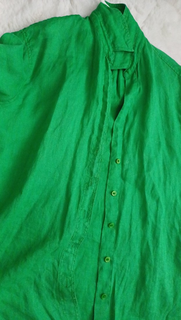 Yeşil keten kadın gömlek, düğmeli ve kısa kollu, yakalı tasarıma sahip. Parlak ve desensiz kumaşı minimalist ve avangart tarzlara uygundur. Günlük kullanım için idealdir.