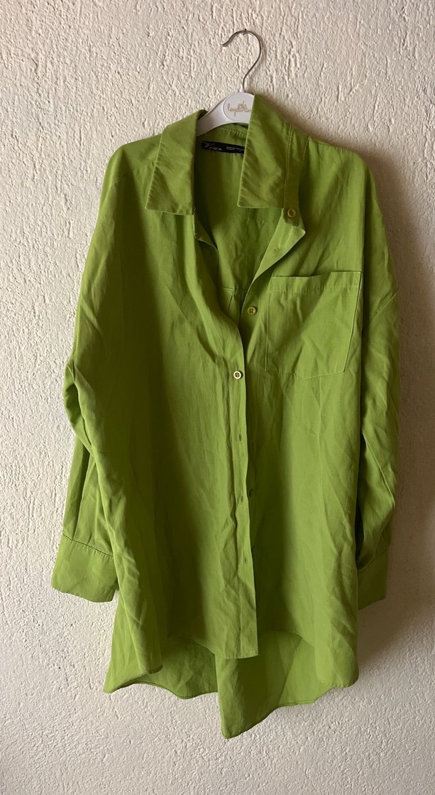 Düğmeli, uzun kollu, yeşil keten gömlek. Rahat kesim, yakası kesim detayı ile günlük kullanıma uygun.
