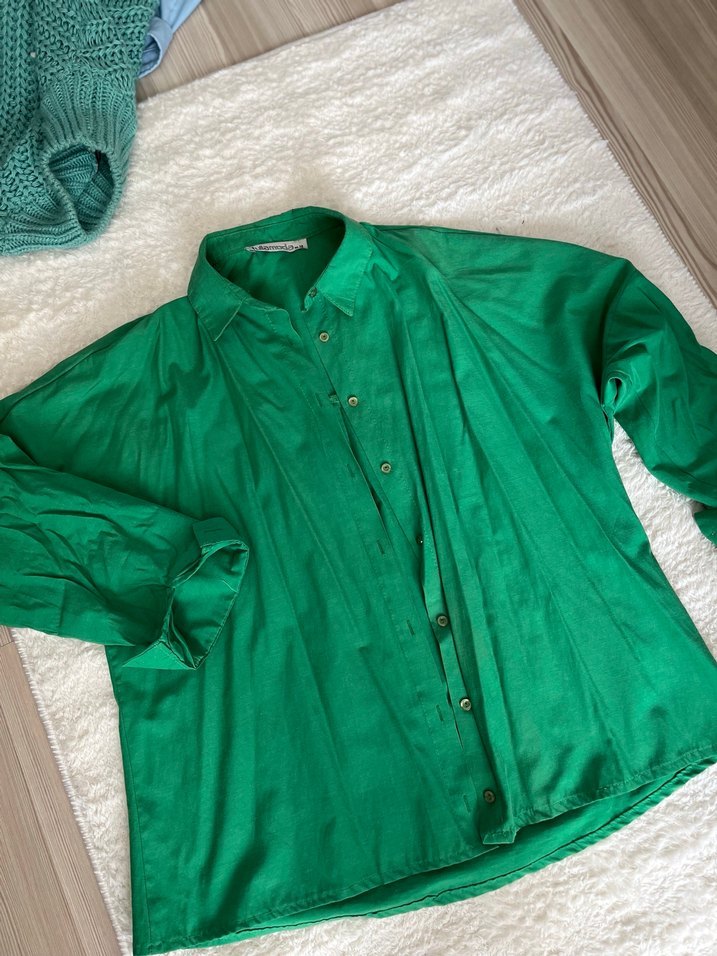 Yeşil keten gömlek, uzun kollu, düğmeli ve yakalıdır. Rahat kesimi ve parlak dokusuyla gündelik kullanıma uygundur.