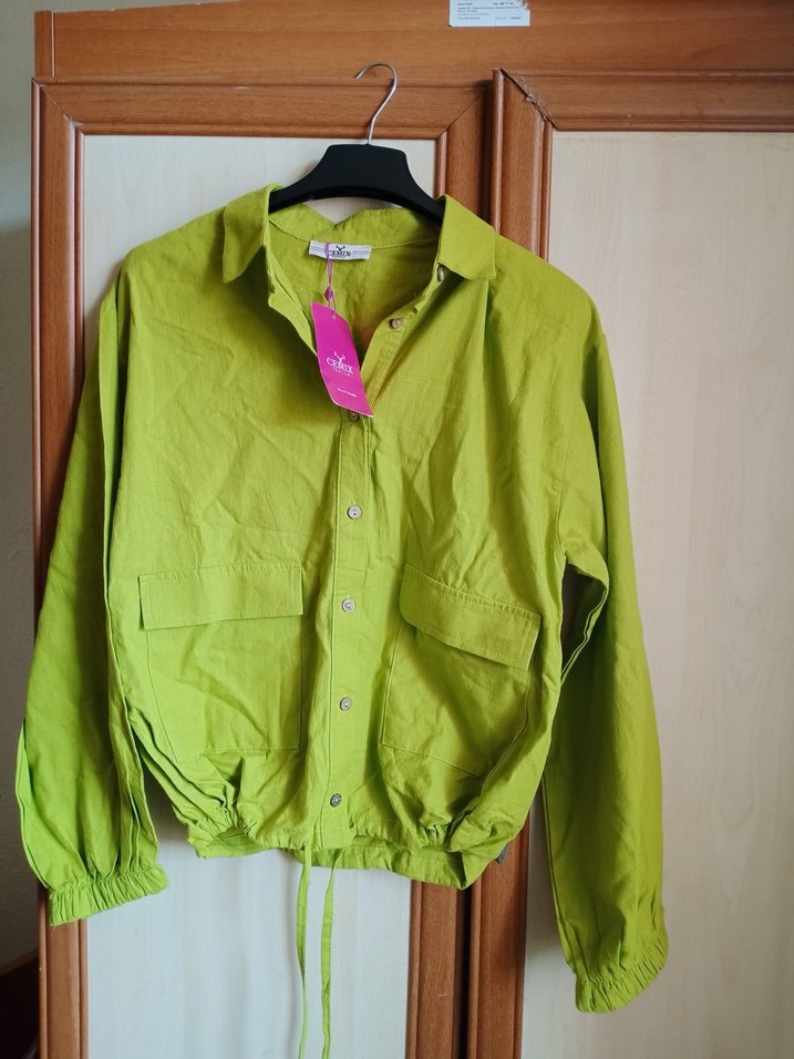 Düğmeli, uzun kollu, yeşil keten gömlek. Salaş kesim, kısa boy, yakalı ve günlük rahat stil için uygun.