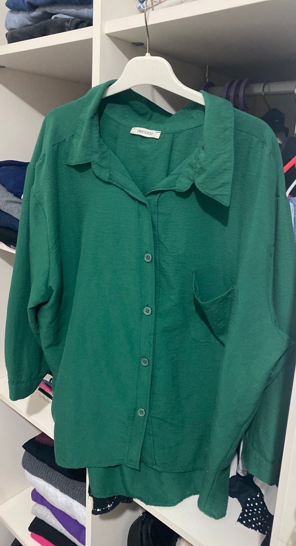 Düğmeli, uzun kollu, yeşil keten gömlek. Salaş kesim ve yakasında çentikli detay bulunur. Günlük rahat kullanıma uygundur. Hafif tüylenmesi var resimde belirttim